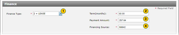 The details required in the Finance section are based on the option you selected from the Sale Type drop-down list and the Finance Type drop-down list.